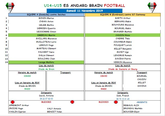 Nos deux équipes commencent la phase 2 de leur championnat respectif. L’équipe A jouera à domicile contre Seiches à 10h30 samedi pendant que l'équipe B se déplacera à Soulaire et Bourg pour jouer contre GJ Cantenay. Venez les encouragez Bon weekend.